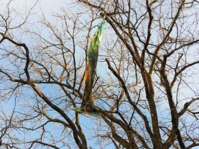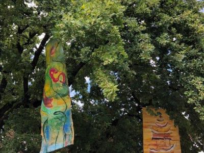 Und Sie sehen noch mehr: Schauen Sie in die Höhe, folgen Sie den lichten Zeichen, den von mir genannten „Segeln“. Sie sind in den letzten Wochen entstanden: für diesen Ort, für diesen Platz. Ich nenne sie Lichtspuren. Folgen Sie ihrer leuchtenden Spur. Noch sind sie hier, im Zustand des Hier, doch sie werden im Laufe der nächsten vier Wochen sich verwandeln, nein: sie werden erwachen. Die diesseitige Materialität ist immer nur eine Vorbereitung, ein Vorbote für das Jenseits: Licht-Leuchtspuren, die im Baum auftauchen und dann wieder im Grünen der Äste verschwinden. Lichtspuren liegen hinter uns oder vor uns und sind Teil unserer Vergänglichkeit.