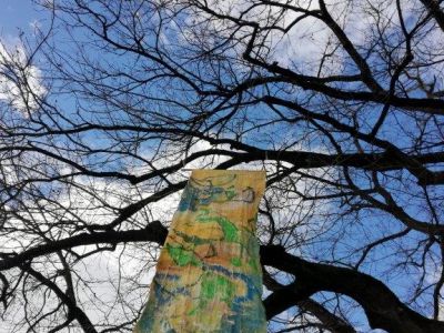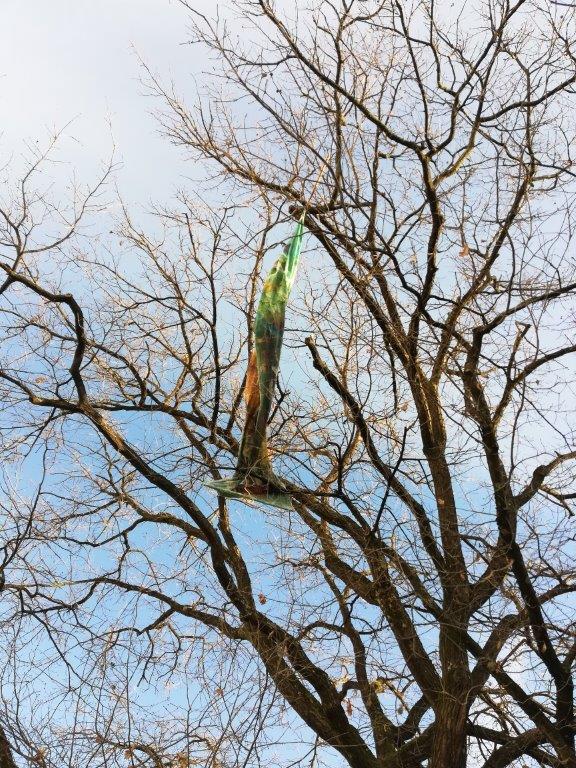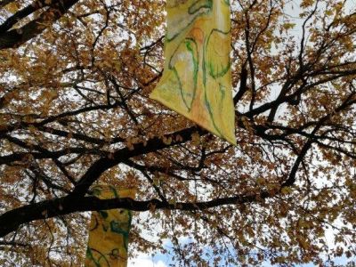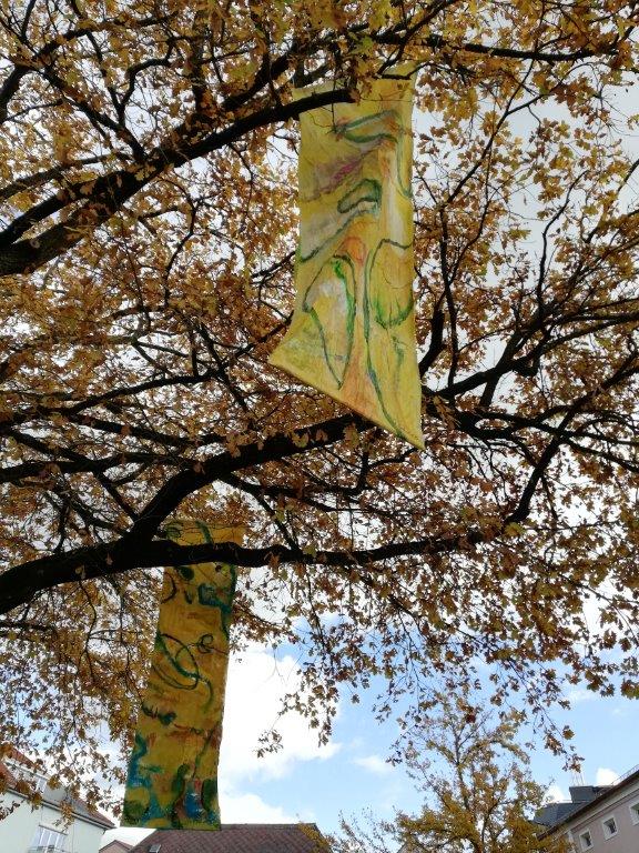 Und Sie sehen noch mehr: Schauen Sie in die Höhe, folgen Sie den lichten Zeichen, den von mir genannten „Segeln“. Sie sind in den letzten Wochen entstanden: für diesen Ort, für diesen Platz. Ich nenne sie Lichtspuren. Folgen Sie ihrer leuchtenden Spur. Noch sind sie hier, im Zustand des Hier, doch sie werden im Laufe der nächsten vier Wochen sich verwandeln, nein: sie werden erwachen. Die diesseitige Materialität ist immer nur eine Vorbereitung, ein Vorbote für das Jenseits: Licht-Leuchtspuren, die im Baum auftauchen und dann wieder im Grünen der Äste verschwinden. Lichtspuren liegen hinter uns oder vor uns und sind Teil unserer Vergänglichkeit.