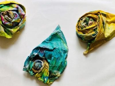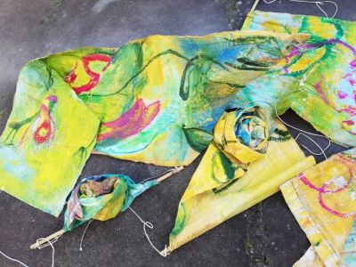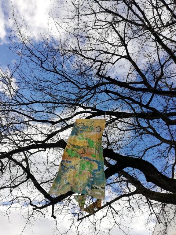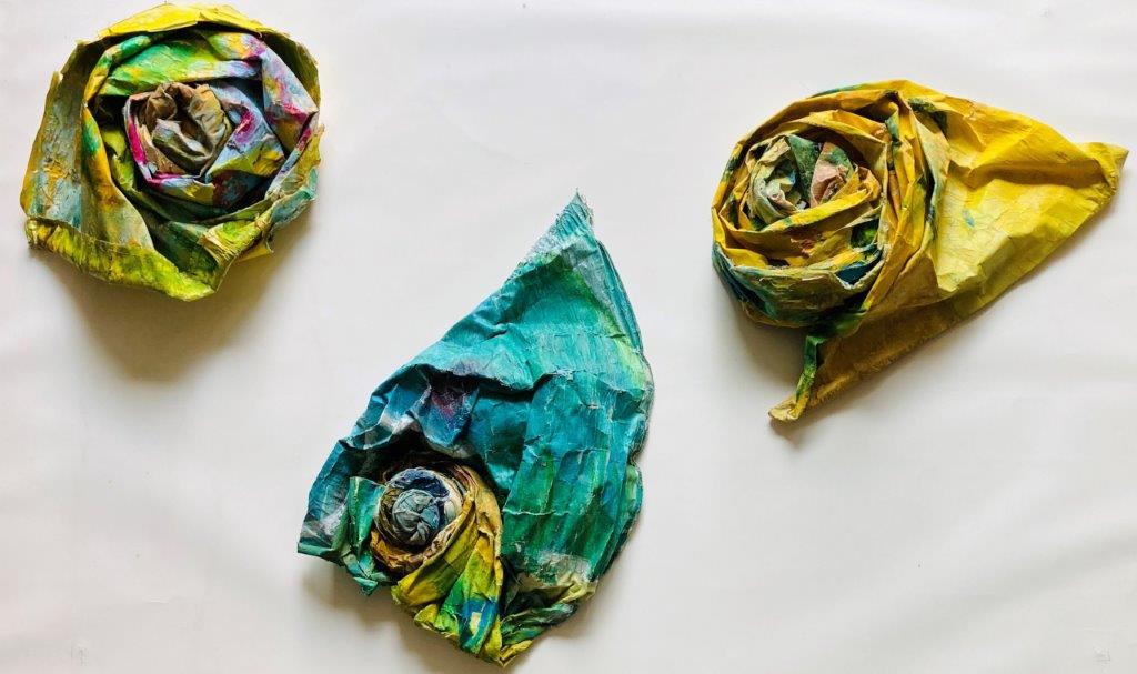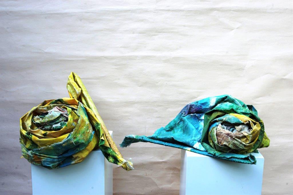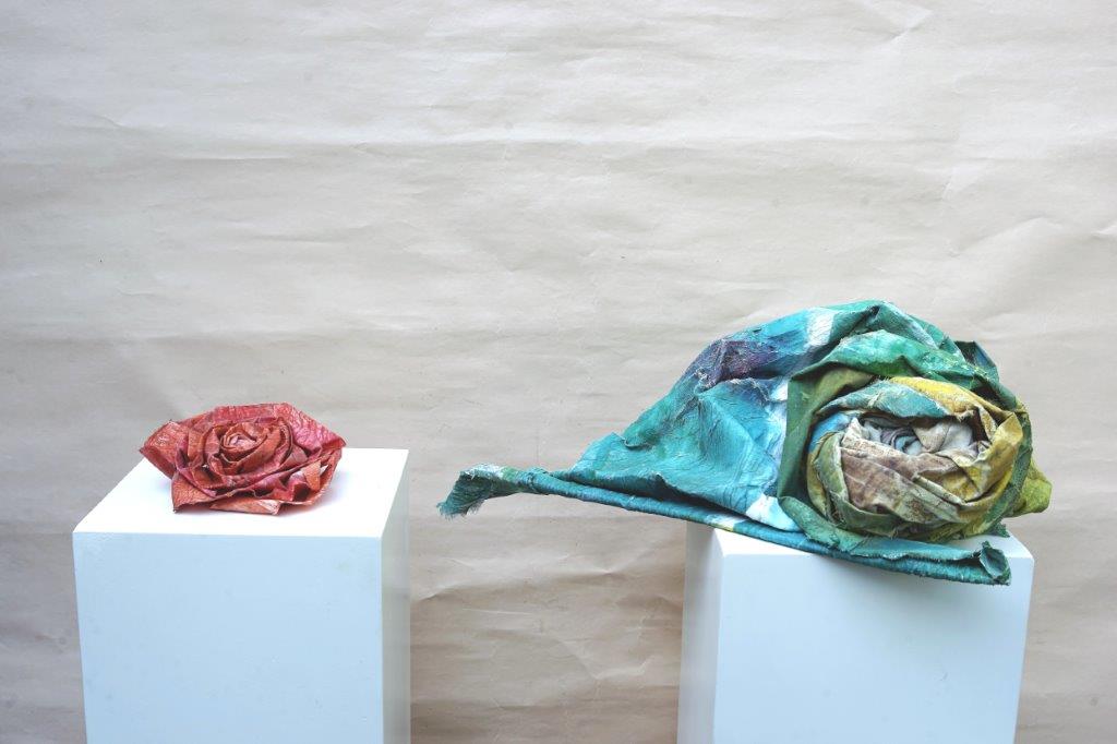 Im Frühjahr 2021 erwachte die Kreativität und ich fotografierte die Segel als Zeugen der Vergänglichkeit. Eine neue Komposition und begann dann, die Blüten daraus zu formen, „Geschwisterblüten“, die sowohl auf einer Stele, auf einer Basis oder an der Wand sehr präsent wirken. Danach entstand das farbige Blütenmeer.